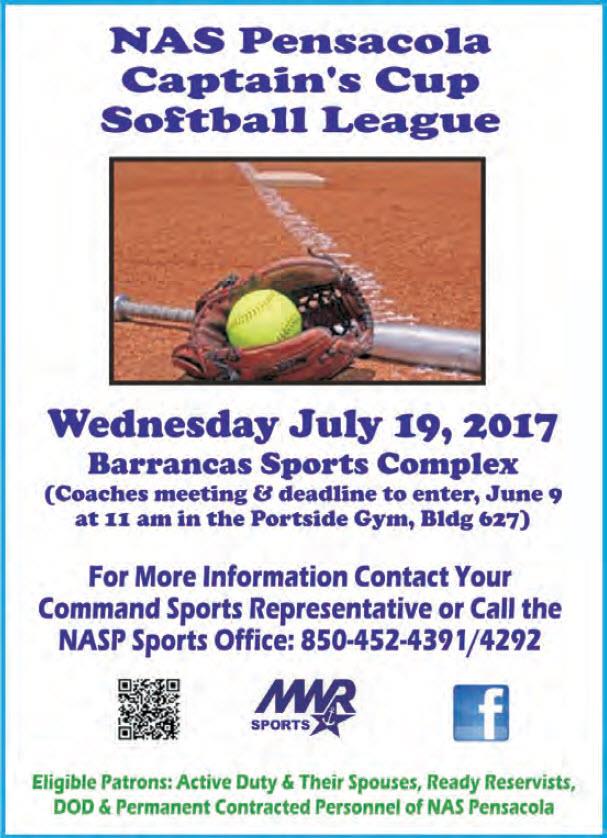 Put together your unit's team and compete in the 2017 NAS Pensacola Captain's Cup Softball League Wednesday, July 19.