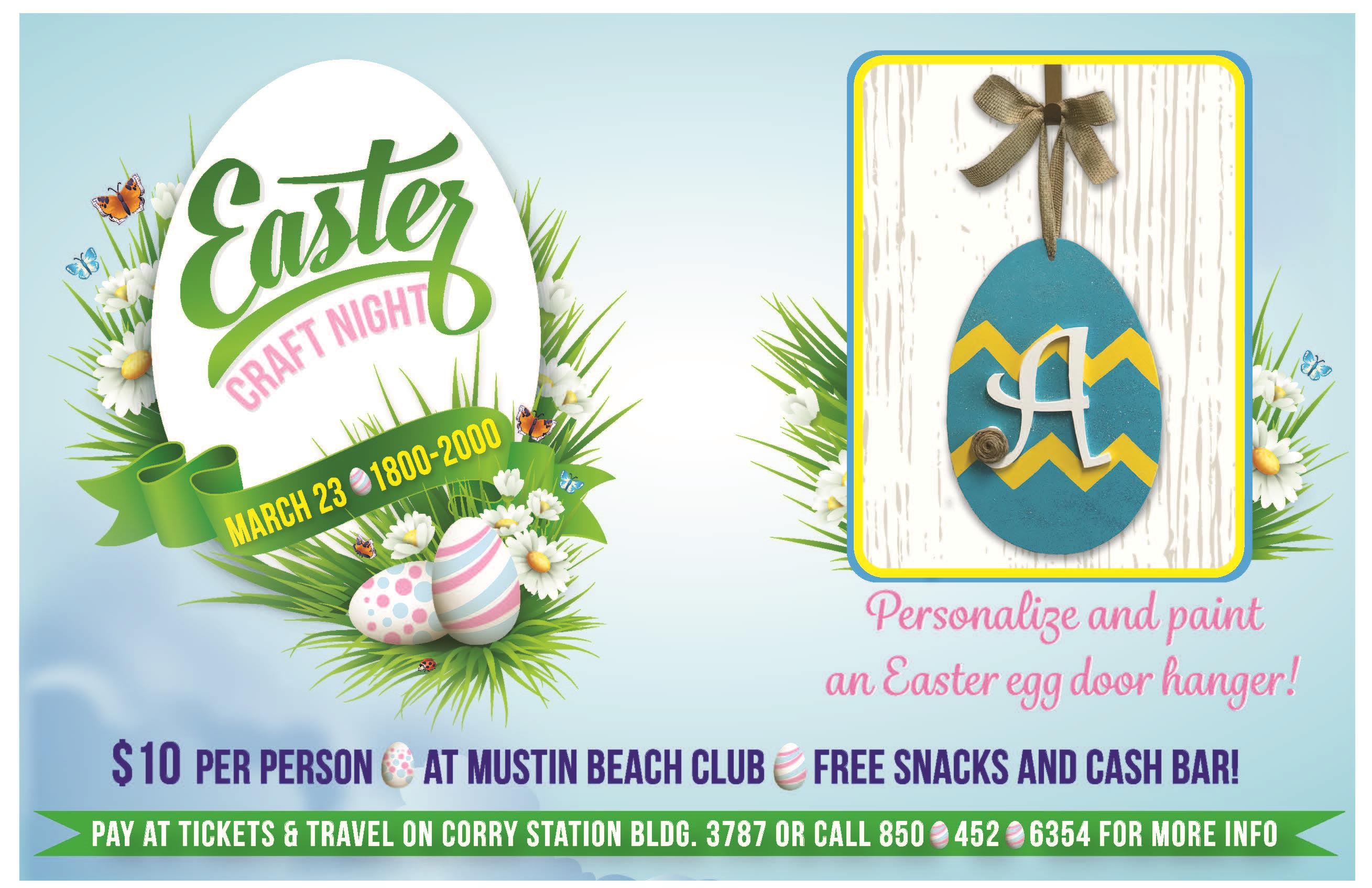 Join us at the Mustin Beach Club Friday, March 23 from 6 to 8 p.m. as we create Easter Egg door hangers. Paint and personalize your egg to create a decoration your family will keep for years to come.