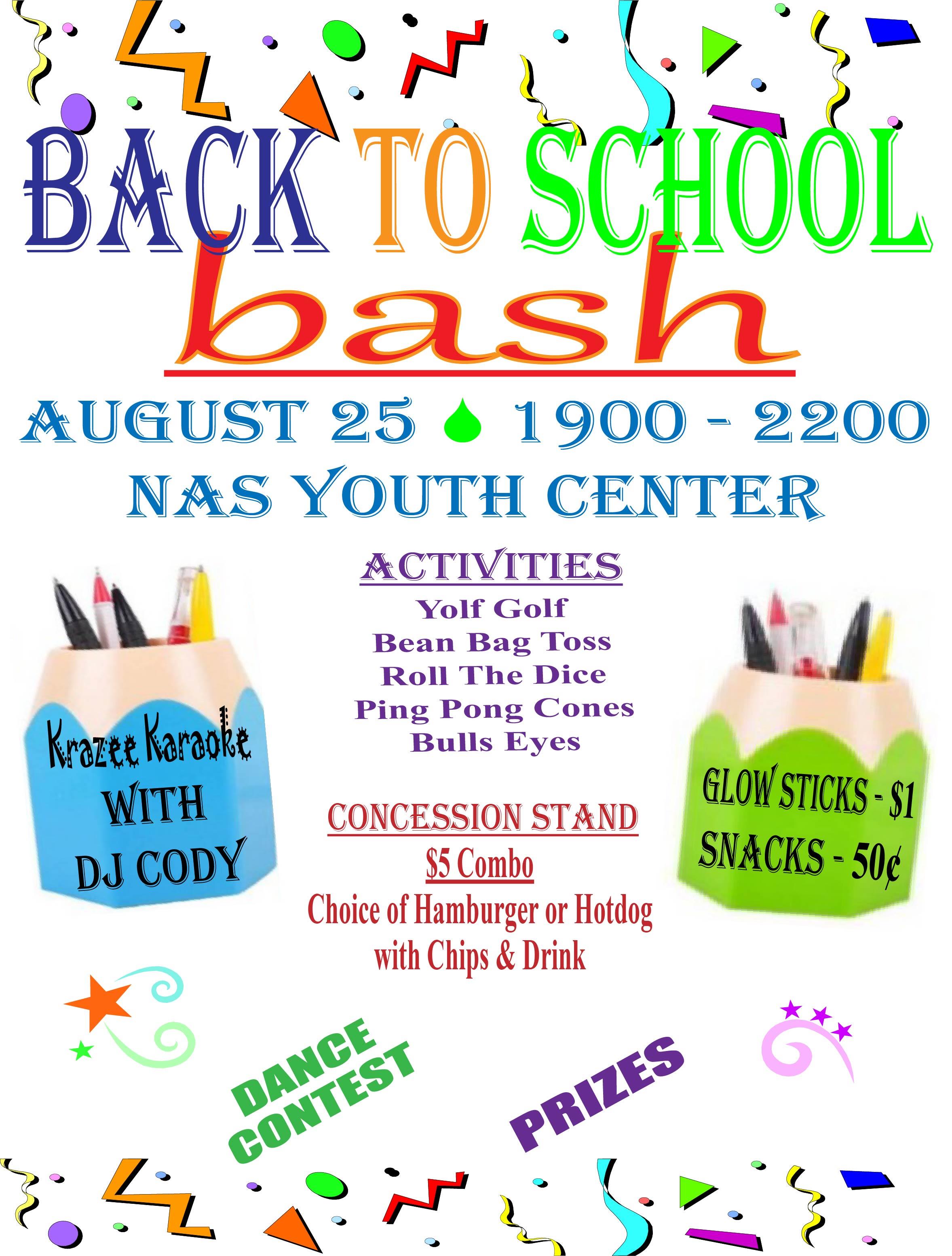 Who says going back to school has to be a bummer? We're celebrating going back to school with a bash Friday, August 25 from 7:00 - 10:00 p.m. at the NAS Youth Center.