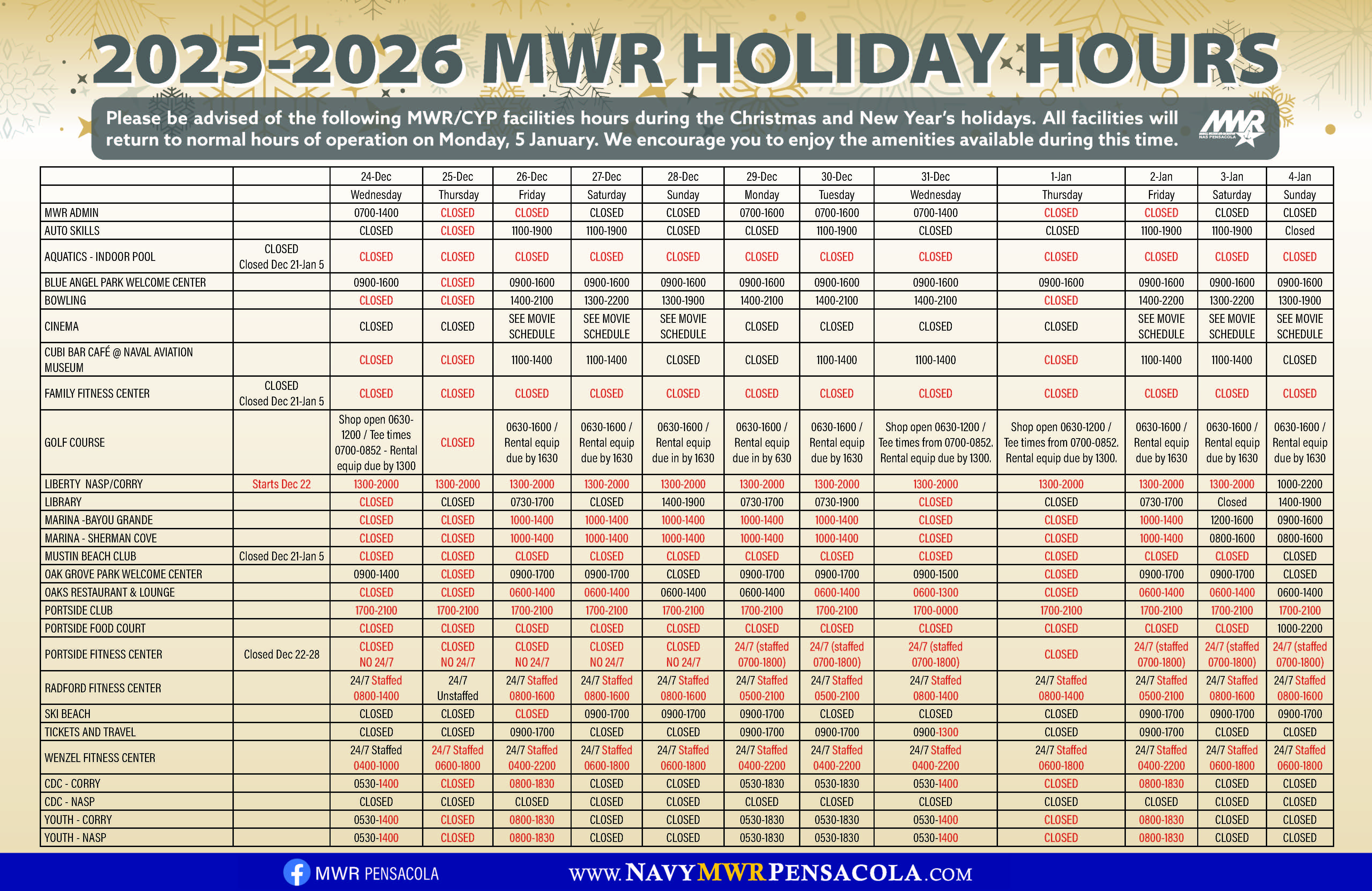Please click here to view the 2025-2026 MWR Pensacola holiday hours.