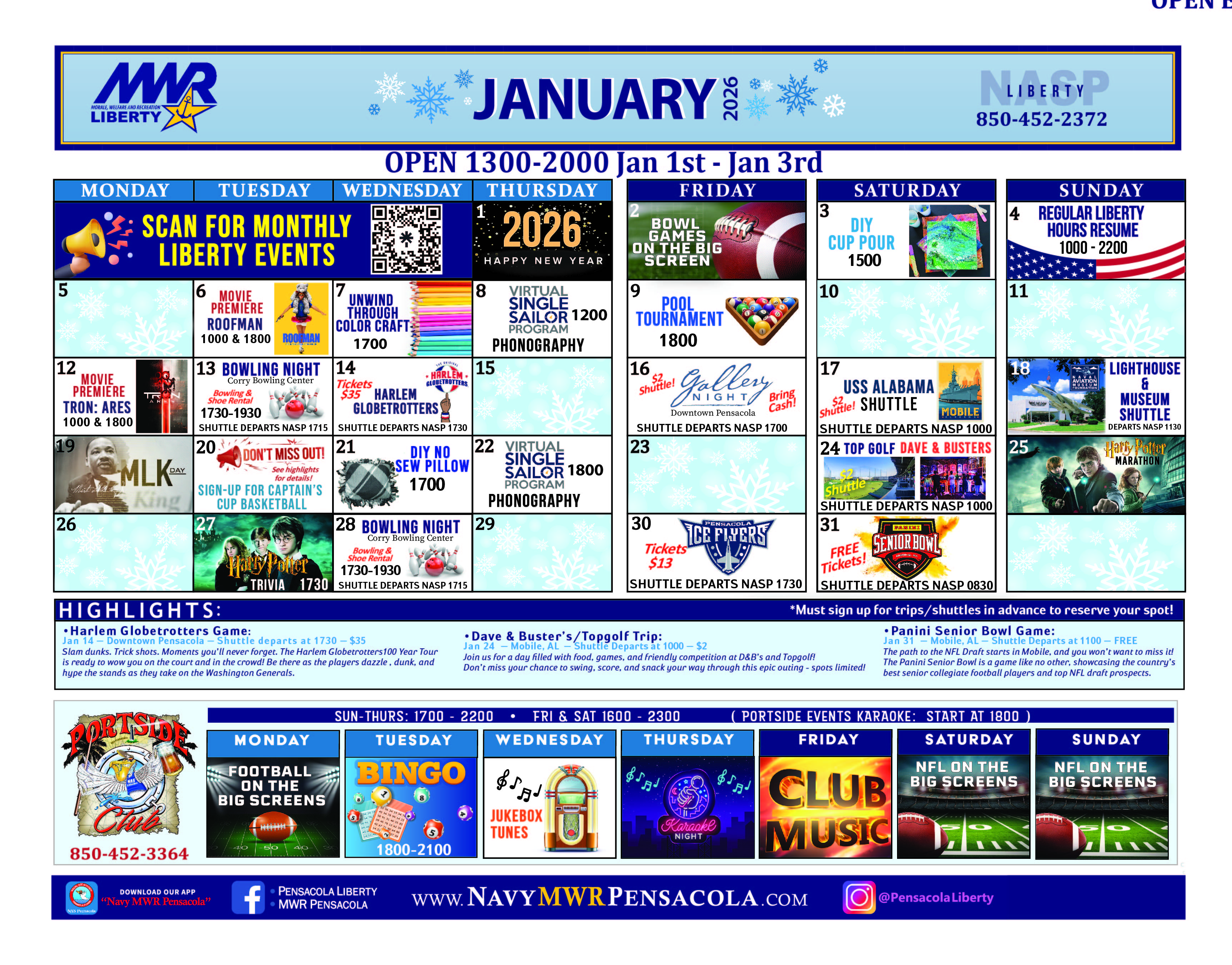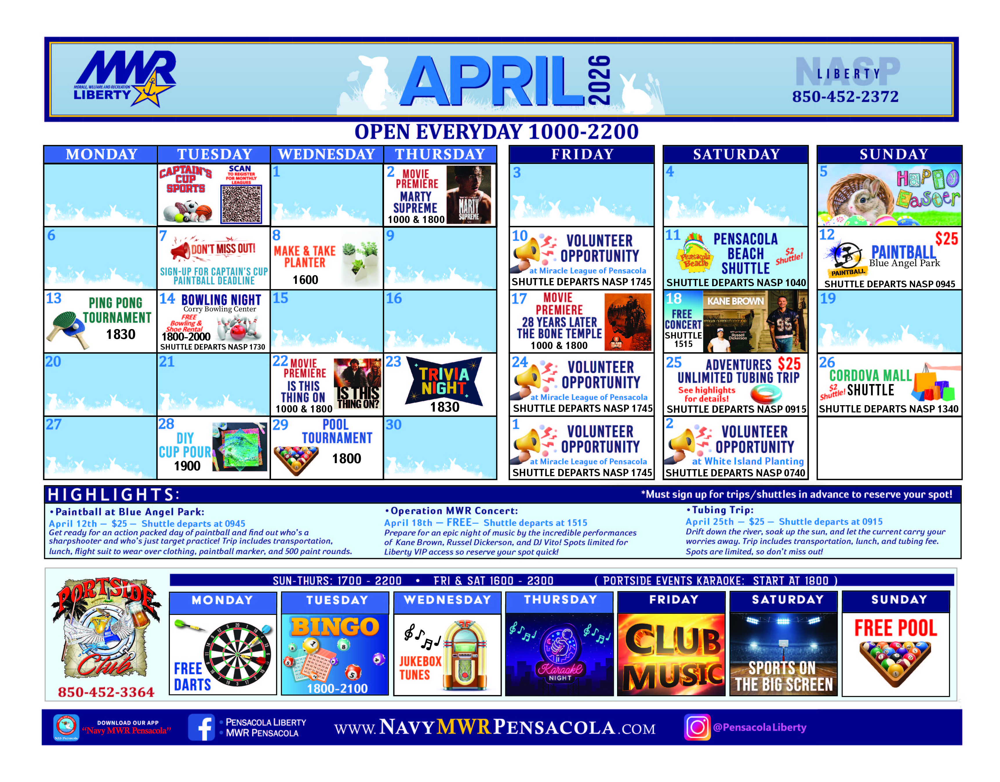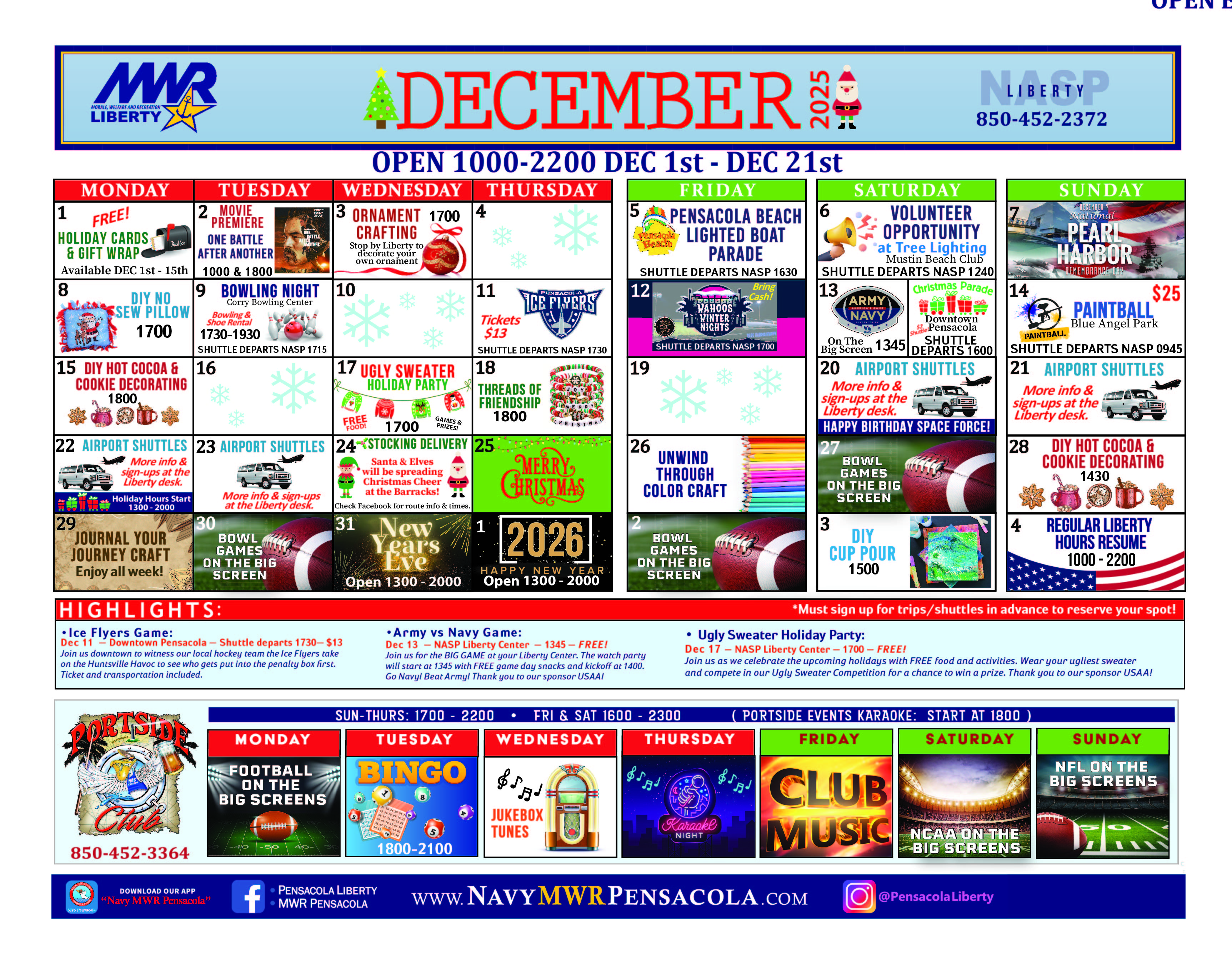 The NASP Liberty Program is proud to serve our active duty enlisted personnel (E1-E6) and geo bachelors. We aim to be your home away from home boasting a variety of amenities and recreational opportunities. Events and trips are the highlight of our program and allow Liberty eligible patrons the opportunity to explore local and surrounding areas such as Disney World, Universal Studios, professional sporting events, beautiful beaches, local festivals, paintball, kayaking, mountain biking, camping, holiday parties, tournaments, crafts, volunteer opportunities and much more. Come visit us!