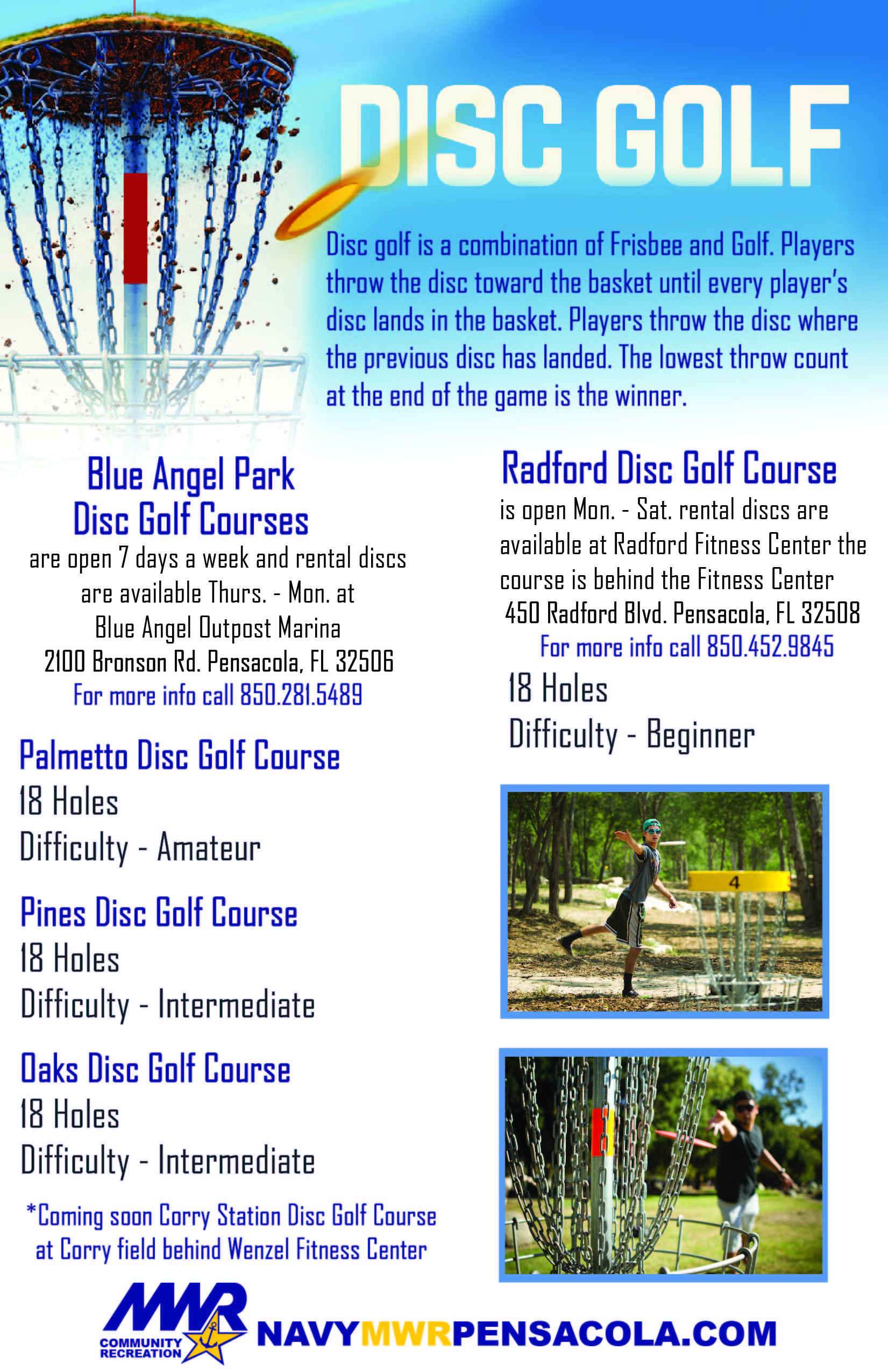 MWR NAS Pensacola/Corry Station hosts two Child Development Centers (CDC) facilities located on base at NAS Pensacola and off-base housing behind NEX at Corry Station. Our program offers full-time and hourly care for children ages six weeks to five years old. Hourly care is based on availability and reservations can be made 30 days in advance.
