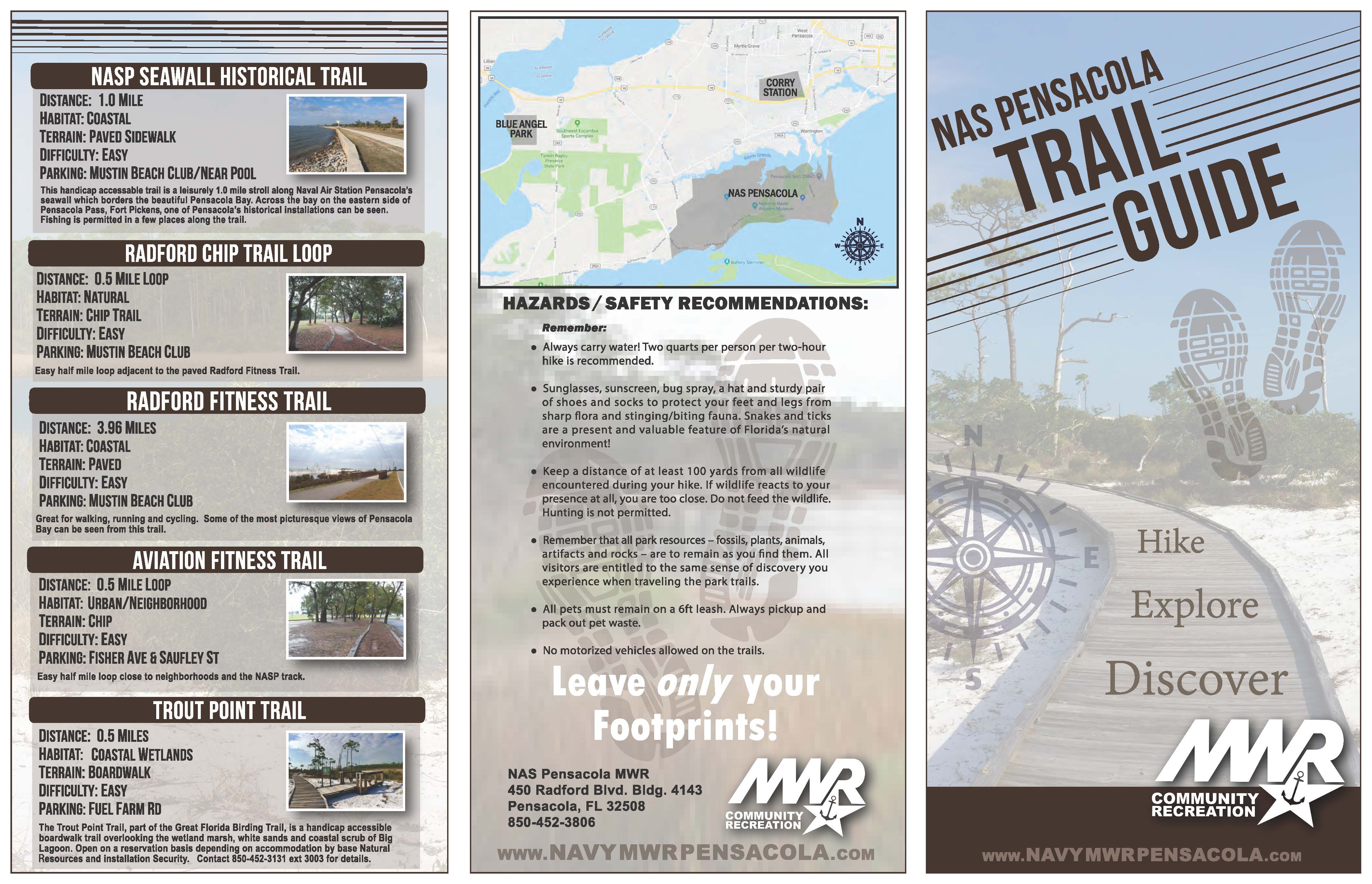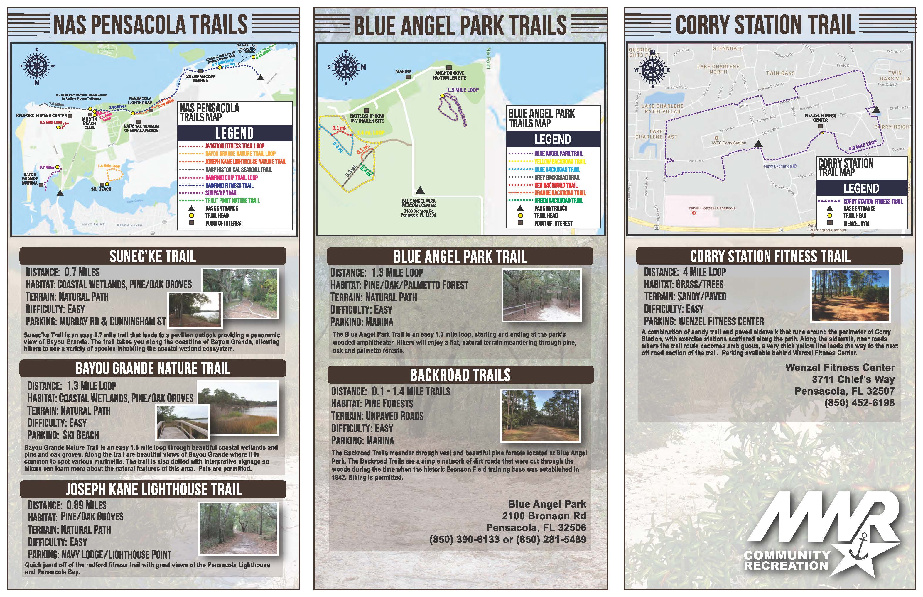 MWR Community Recreation and Fitness have a variety of nature trails onboard NAS Pensacola, Corry Station and Blue Angel Park. They are a great way to get outdoors and enjoy a scenic walk or run. Take the time to explore them all!
