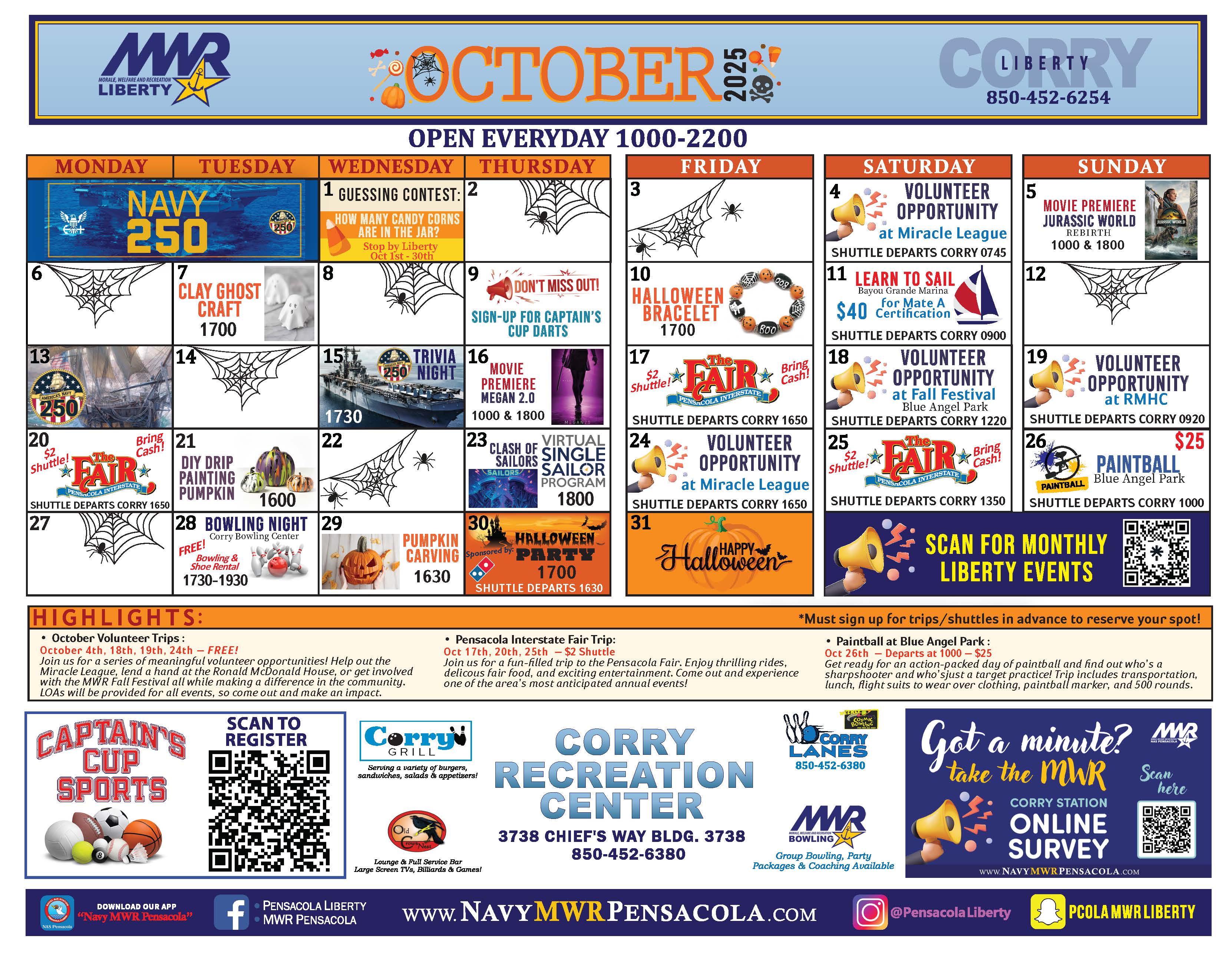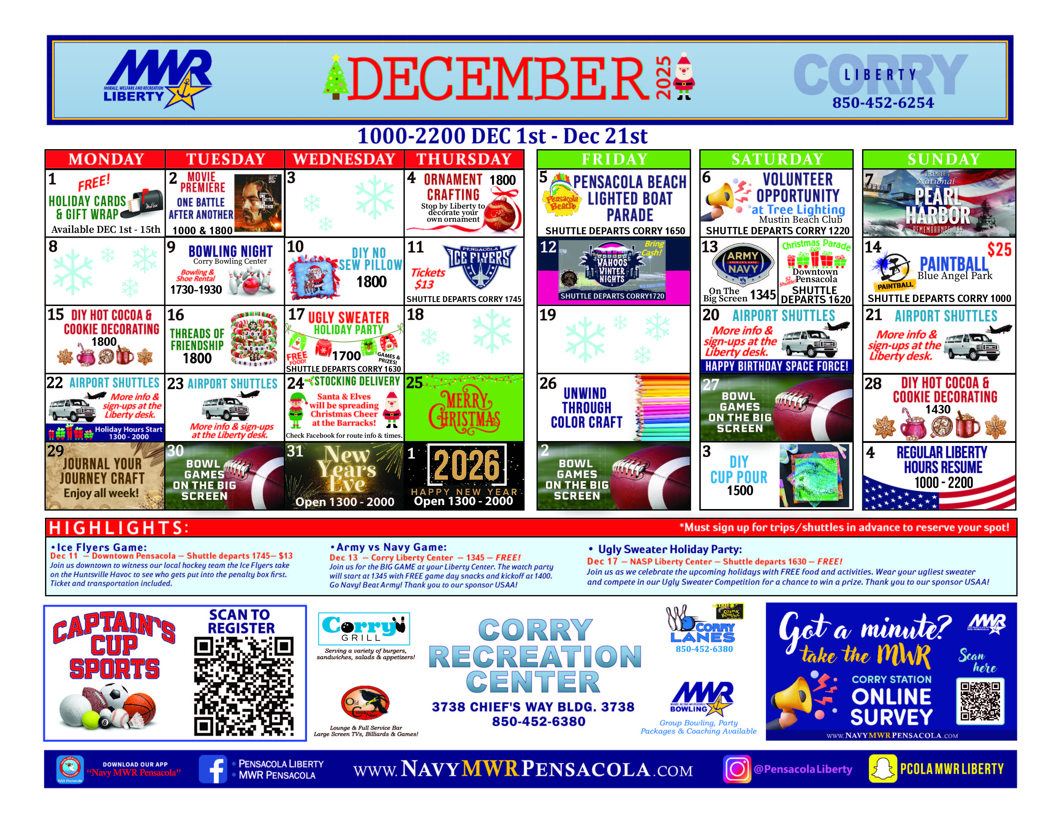 The Corry Station Liberty Program is proud to serve our active-duty enlisted personnel (E1-E6) and geo bachelors. We aim to be your home away from home boasting a variety of amenities and recreational opportunities. Events and trips are the highlight of our program and allow Liberty eligible patrons the opportunity to explore local and surrounding areas such as Disney World, Universal Studios, professional sporting events, beautiful beaches, local festivals, paintball, kayaking, mountain biking, camping, holiday parties, tournaments, crafts, volunteer opportunities and much more. Come visit us!