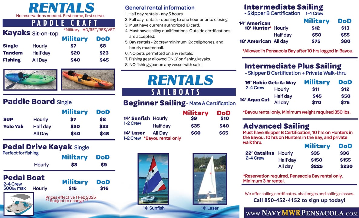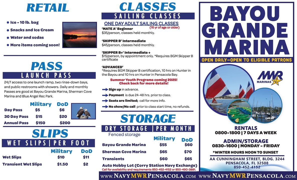 For more information or to make a reservation, please call us at 850-452-4152. Our office is located at Bayou Grande Marina, NAS Pensacola.