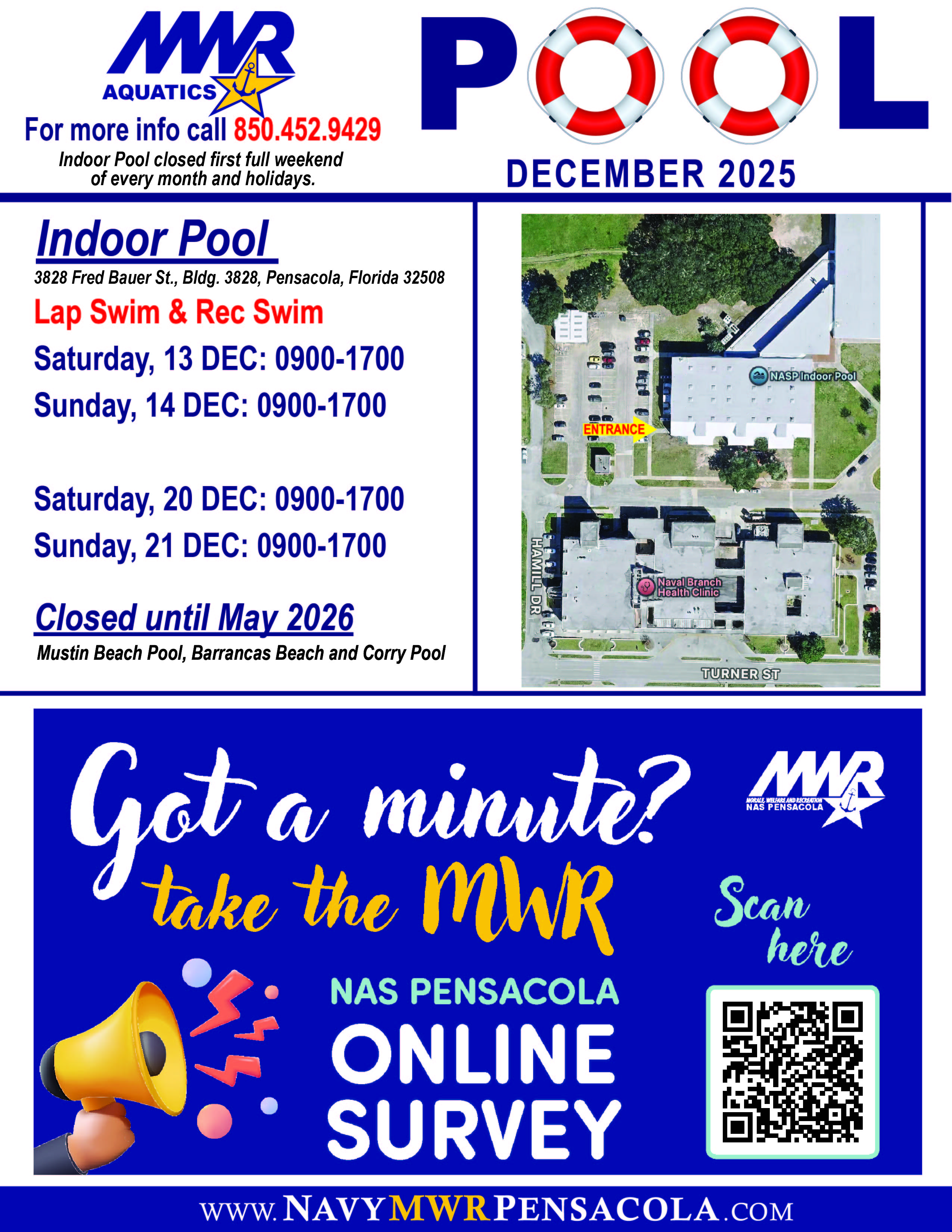 Aquatics Office: Located in Bldg. 3203 directly behind the Mustin Beach Club on the Mustin Pool Deck.