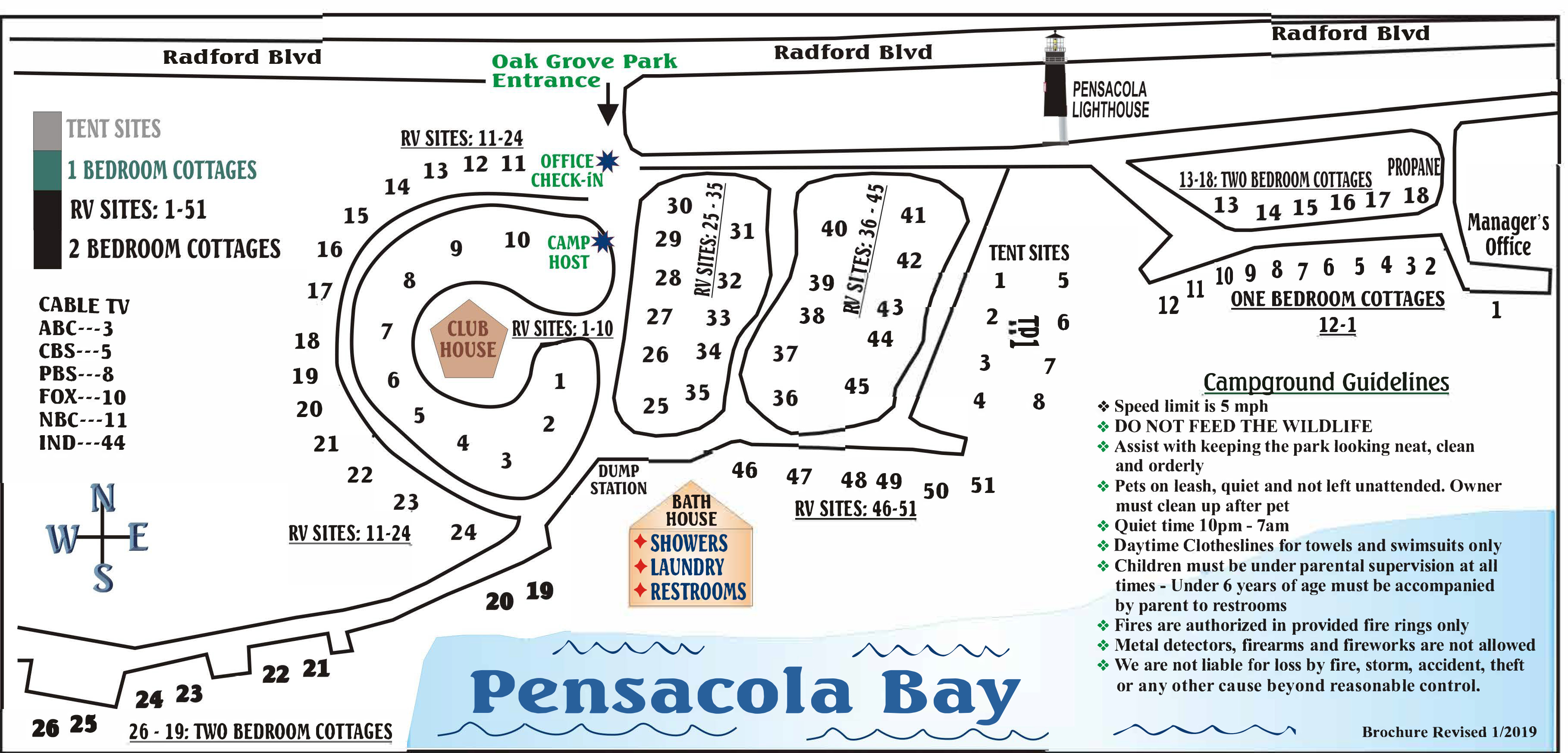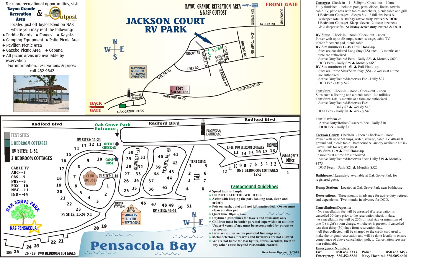Oak Grove Park is located under the Oaks along the beach off Radford Blvd. You can cool off and swim at the beach nearby. It is within walking distance to the National Museum of Naval Aviation. There are 26 fully equipped cottages and 51 RV sites with full hookups. Reservations recommended and are taken during office hours. Credit cards accepted.